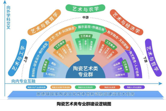 学院以工艺美术国家级一流专业为核心,联动7个本科专业,构建了服务陶瓷全产业链的“陶瓷艺术类专业群”。在此基础上,创新提出并实践 “五融五建五交叉”人才培养模式:“五融”即专业群与陶瓷产业链五大板块深度融合;“五建”即精准对接试验区建设五大任务;“五交叉”即推动艺术与哲学、工学、农学、教育学、经济学交叉融合,培养产业急需的复合型创新人才。