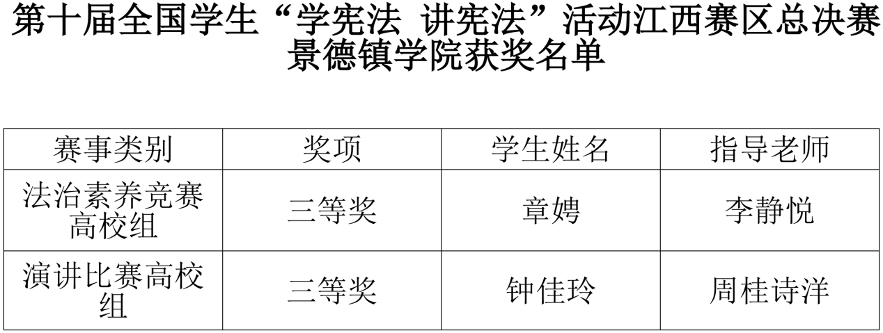 (本网讯:付珍)近日,江西省教育厅公布第十届全国学生“学宪法 讲宪法”活动江西赛区总决赛获奖名单,我校学子在法治素养竞赛和演讲比赛两大板块中表现优异,在法治素养竞赛(高校组)中,我校章娉同学荣获三等奖;在演讲比赛(高校组)中,钟佳玲同学荣获三等奖,展现了我校学子扎实的法治知识功底和良好的综合素养。获奖名单截图此次获奖是学校法治教育成效的体现。未来,我校将继续推进宪法法治教育,丰富教育形式,引导学生树立法治观念,...