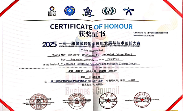 (本网讯:经济管理学院)近日,2025一带一路暨金砖国家技能发展与技术创新大赛第二届酒店数字化运营与营销赛项全国总决赛在云南德宏职业学院圆满落幕。经济管理学院2024级酒店管理班胡家玉、黄敏两名同学,在刘瑜辉、杨丽华老师的指导下,凭借扎实的专业能力斩获本科组一等奖,为我校赢得荣誉。获奖证书 经管学院供图本次赛项以“面向国际市场、突出中国特色、应用数字技术、提升数字应用”为宗旨,紧扣酒店行业数字化转型趋势,旨在培养兼具国际化视野与高技术技能的复合型人才。...