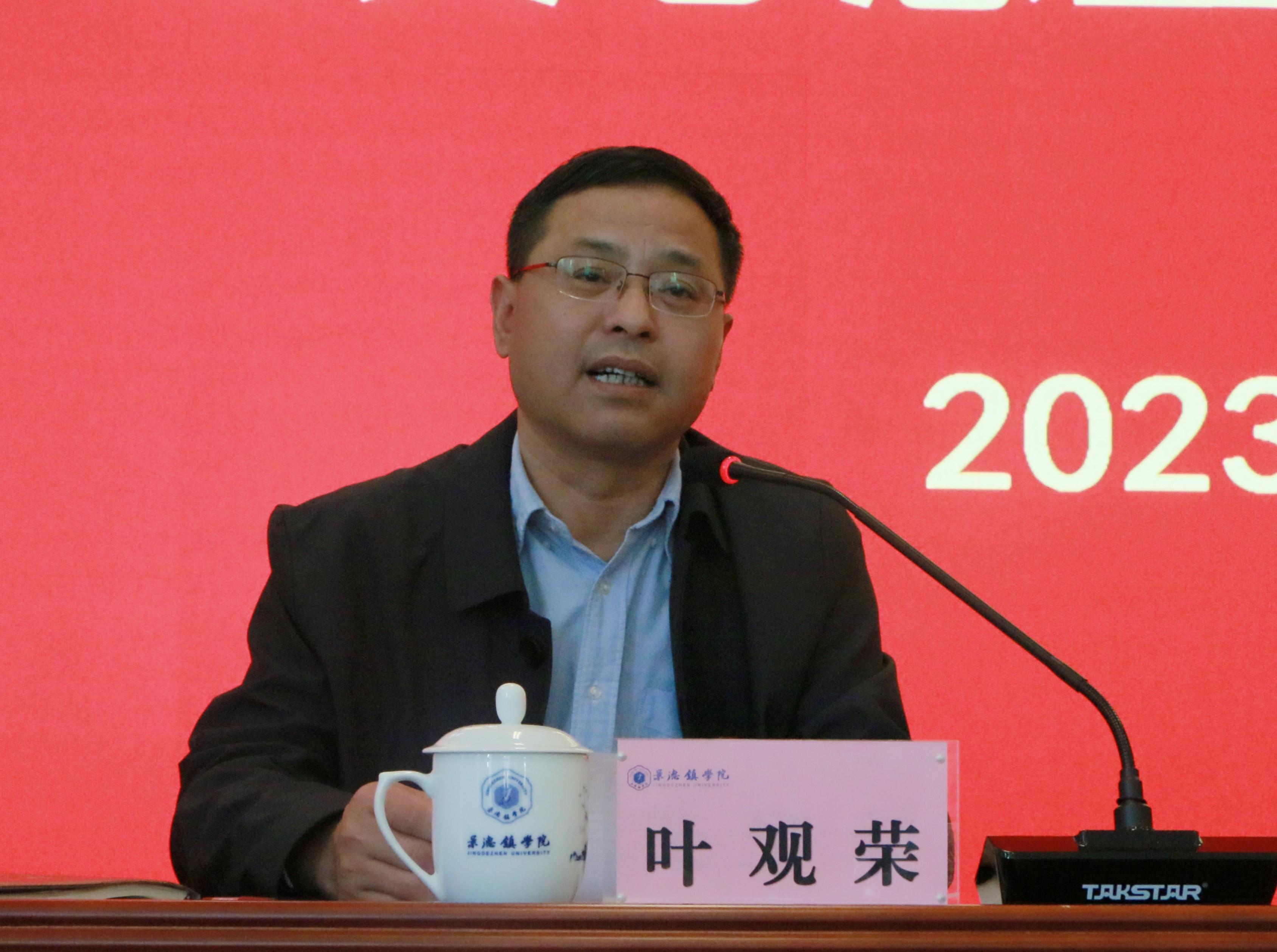 叶观荣表示全校党员干部师生要认真学习、深刻领会,高标准、高质量、高水平推进主题教育开展。要压紧压实领导责任,各二级学院党委、各党总支,各单位、各部门要高度重视,加强组织领导,切实履行第一责任人职责,把主题教育谋划好、组织好、落实好;要坚决防止形式主义,紧密结合实际,大兴调查研究,把理论和实践相结合,推动主题教育走深走实,确保习近平新时代中国特色社会主义思想落地见效;要重视宣传引导工作,充分发挥校园网站、微信公众号、校报等宣传平台作用,注重运用纸媒和新媒体相结合的方式营造浓厚氛围,全面反映全校主题教育进展成效,推动学校主题教育工作高质量、有特色。