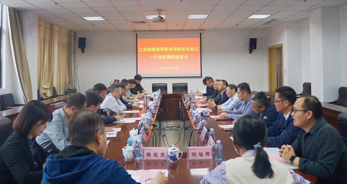 (本网讯:叶梦梦)10月7日下午,江西旅游商贸职业学院校长彭元来我校进行调研,江西旅游商贸职业学院党委委员、副校长杨福盛,党委委员、教务处处长、经管学院院长刘繁荣,党委委员、旅游学院院长张蕾,党委委员、学工处处长江敏,后勤管理处处长付忠辉,招生考试处处长马志亮,财务处副处长(主持工作)蔡玲,教务处副处长何丽娜及相关部门负责人一同来访。校党委副书记、校长陈运平,校党委委员、副校长方漫热情接待,双方在行政楼318会议室围绕校园建设运行思路、模式和经验,专业建设、教师培训、学生培养等方面进行座谈交流。