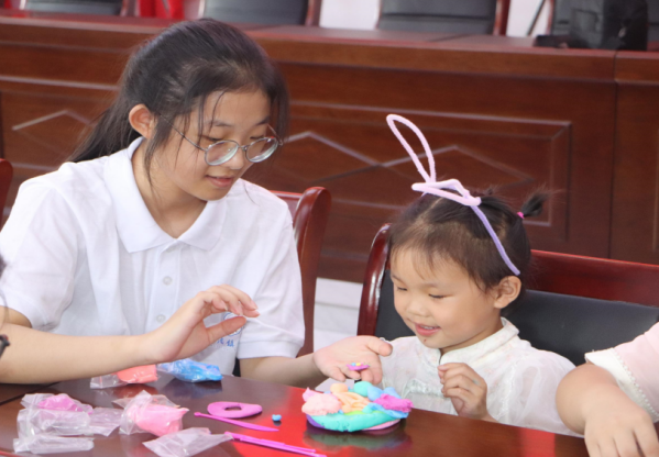 队员正在指导留守儿童用超轻黏土进行手工创作 戴方晴摄