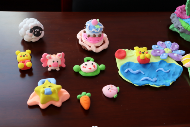 队员们通过先展示事先制作好的粘土作品,来为孩子们讲解超轻粘土的操作用法以及注意事项。小朋友们在队员们的指导下,通过揉、捏、搓、贴等步骤,充分发挥想象力和创造力:小小的手指,在空中舞动,化作一道绚丽的弧线,五颜六色的粘土变幻出千变万化的形状,让美好的童话在指间绽放,一个个可可爱爱的小动物和小花朵手工作品诞生了。孩子们看着自己亲手制作的小作品喜不自禁,纷纷表示要带回家送给家人,要与大家一起分享美育课带来的喜悦。