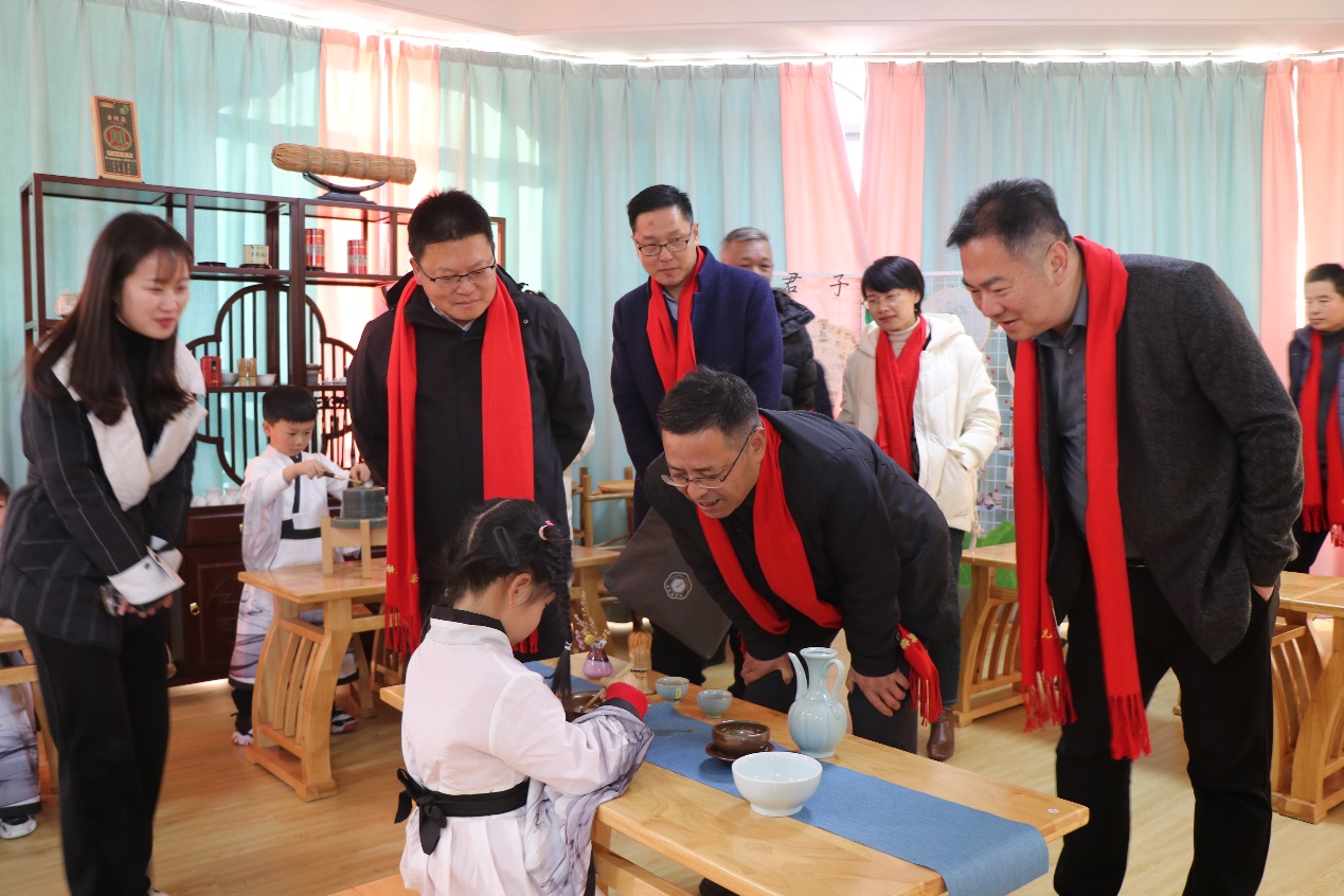 叶观荣一行先后参观了浮梁县第二幼儿园的教室、食堂、茶园、茶艺室等场所,观摩了孩子们的茶艺课程学习展示,详细了解校园办学理念、办学特色、发展规划、基础设施建设、师资队伍、教学管理等情况,并就推进“景德镇学院与浮梁县第二幼儿园协同提质行动实施方案”等内容进行座谈交流。